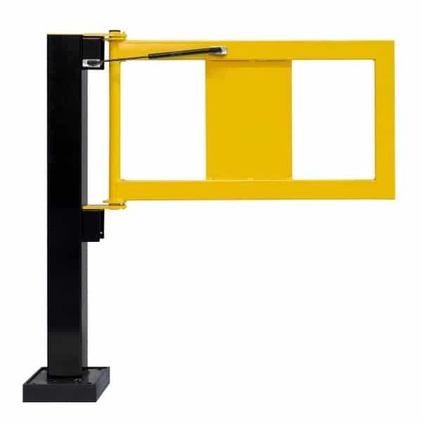 Additionally, it includes a welded panel that enhances durability and visibility, and it can accommodate a warning sign if necessary (sign not included). A gas cylinder facilitates the self-closing feature. Please note that a separate installation post is required.