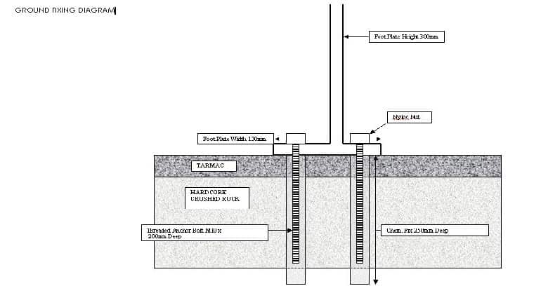 - Footplates are bolted down with M10 x 130mm Threaded Rod and Washer/Nut with chemical resin