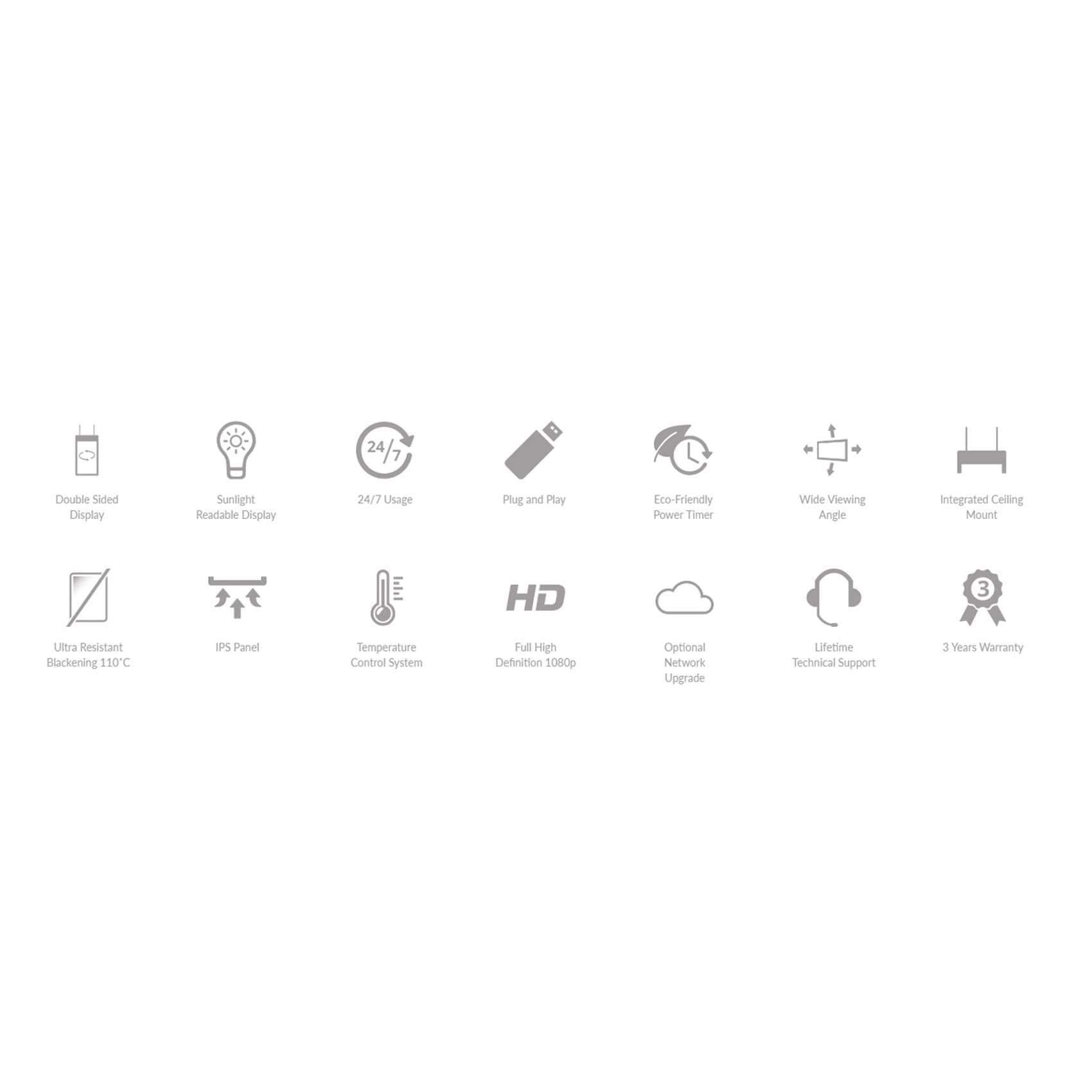 The Double Sided Hanging Displays come with a built in HD Android media player, allowing you to update them using a USB memory stick. Load your pictures and videos onto a USB memory stick then insert it into the display, which will copy the files into its internal flash memory. Once you remove the memory stick the screen will then start playing the pictures and videos in a continuous loop.