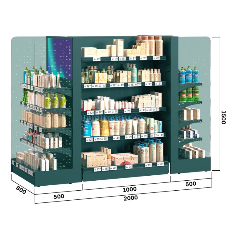The Premium Gondola Island is the first thing customers see after entering the pharmacy.
