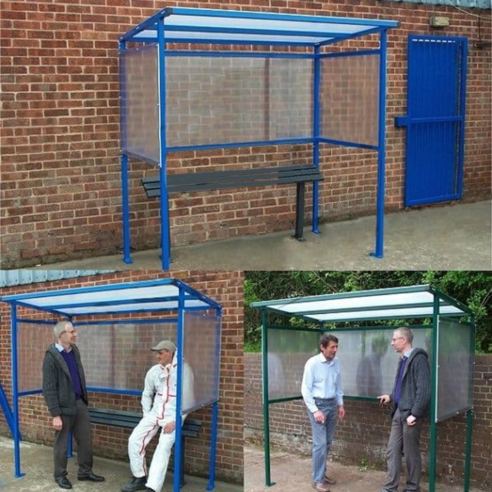 The smoking shelter has a specific design to protect people, smokers or non-smokers, from the back and above no matter what the weather is. Aside from its purpose as a smoking shelter, it can also be used as a spectator viewing area, a parent or staff waiting area, or a designated break time area. When positioned correctly, it provides substantial shelter from rain on wet days and the sun on hot days.