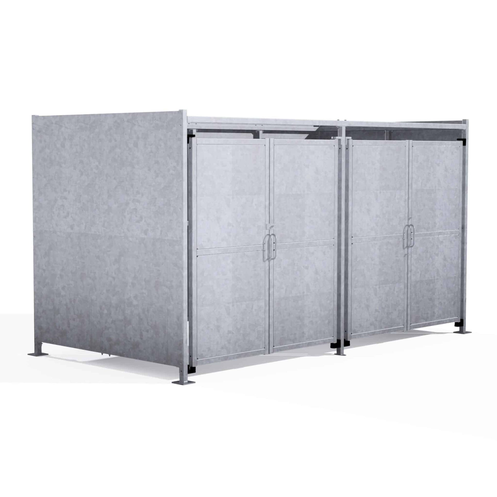 The Eaton Bin Store shelter is a free-standing shelter with Galvanised Clad Doors lockable by padlock (not included) designed for on site assembly, constructed from galvanised mild steel. Complete with Galvanised sheet roof, and side panels.